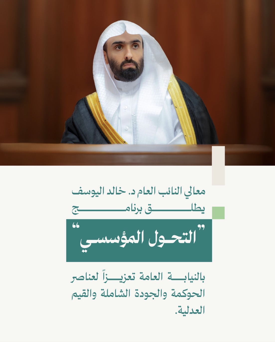 في ظل الدعم والاهتمام الذي يوليه خادم الحرمين الشريفين وسمو ولي العهد رئيس مجلس الوزراء –حفظهما الله– لتطوير المنظومة العدلية، وتعزيز كفاءة مؤسساتها والارتقاء بخدماتها، أطلق معالي النائب العام رئيس مجلس النيابة العامة د. خالد بن محمد اليوسف برنامج “التحول المؤسسي” للنيابة العامة، في إطار التوجه نحو تطوير بيئة العمل وتعزيز بناء منظومة مؤسسية أكثر كفاءة وفاعلية، بما يسهم في تحسين جودة الأداء ورفع مستوى الخدمات، ويواكب متطلبات التحديث والتطوير المؤسسي.